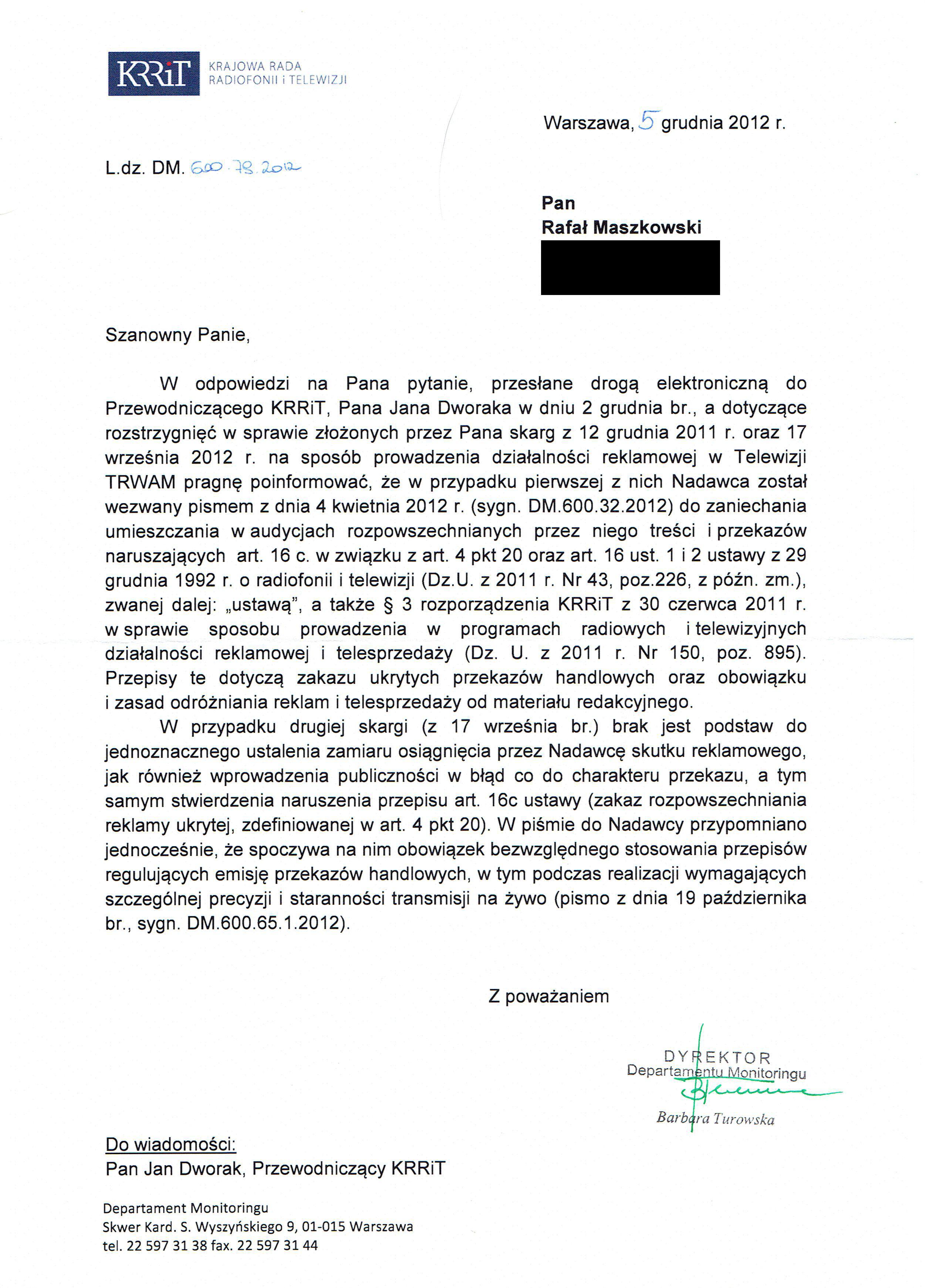 ustawy o radiofonii i telewizji. Chodzi o nadawanie nieoznakowanych reklam przez TV Trwam. Zostałem o tym poinformowany jako autor skargi z 12 grudnia 2011 r.