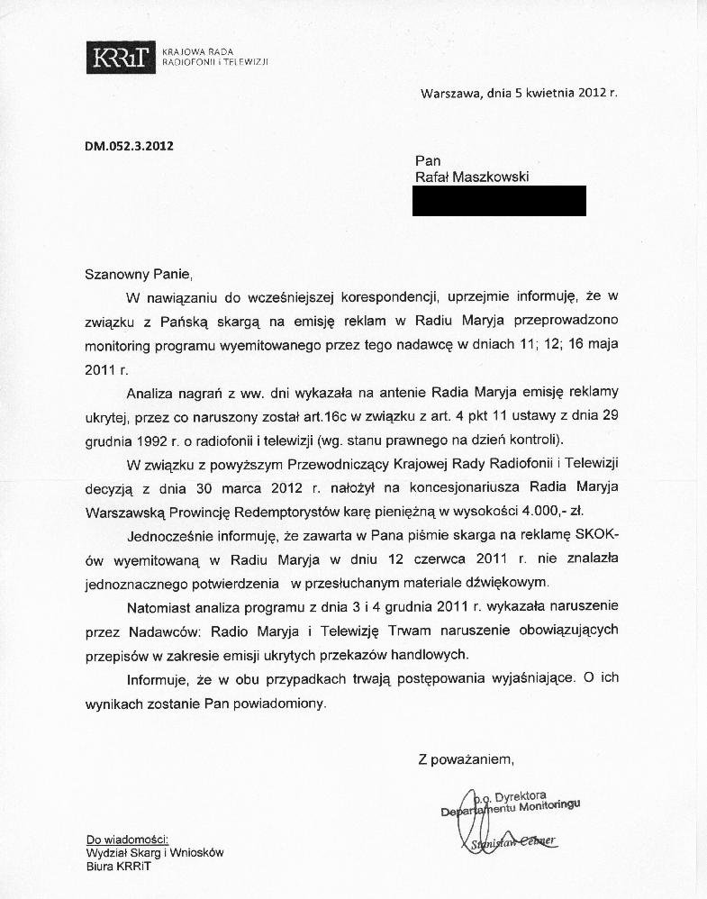 Radio Maryja za nielegalne reklamy. Kara wynosi 4 tys. zł. (odpowiedź