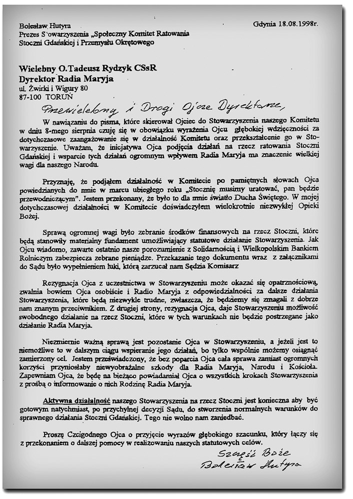 - 18 VIII 1998: podziękowanie za udział w Stowarzyszeniu SKRSGiPO, B. Hutyra do o. T. Rydzyka