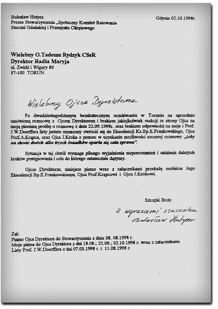 - 2 X 1998: prośba o spotkanie, B. Hutyra do o. T. Rydzyka, kopie do bp. E. Frankowskiego, o. A. Krąpca, o. J. Kroka