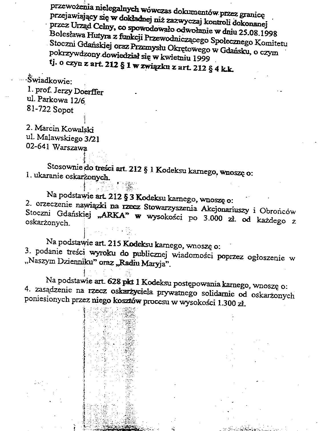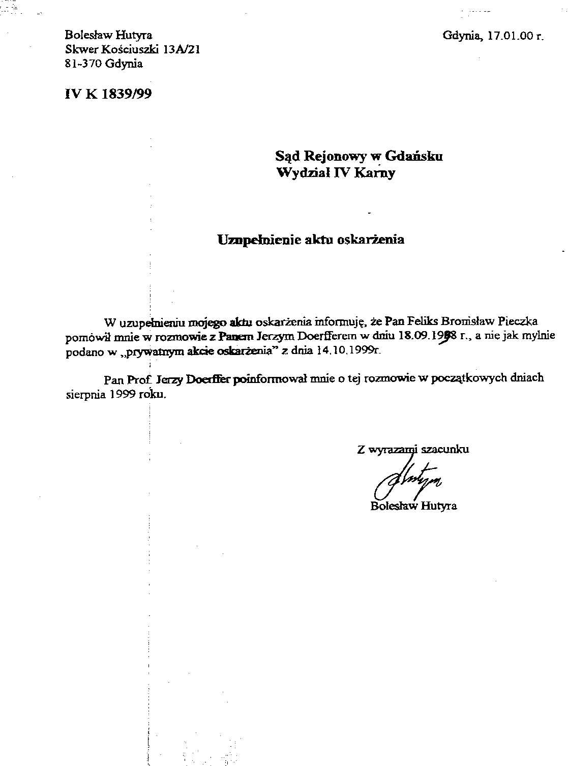 - 17 I 2000: uzupełnienie aktu oskarżenia, B. Hutyra do Sądu Rejonowgo w Gdańsku