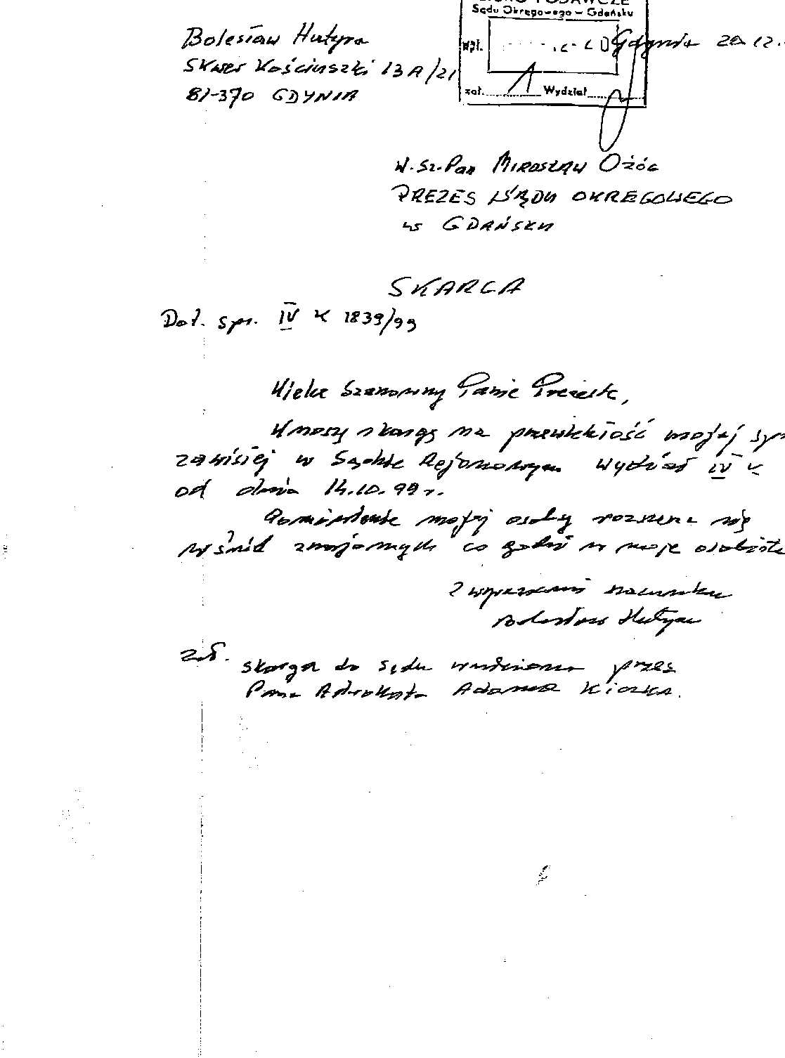 - 20 XII 1999: skarga na przewlekłość postepowania, B. Hutyra do M. Ożoga, prezesa Sądu Rejonowego w Gdańsku