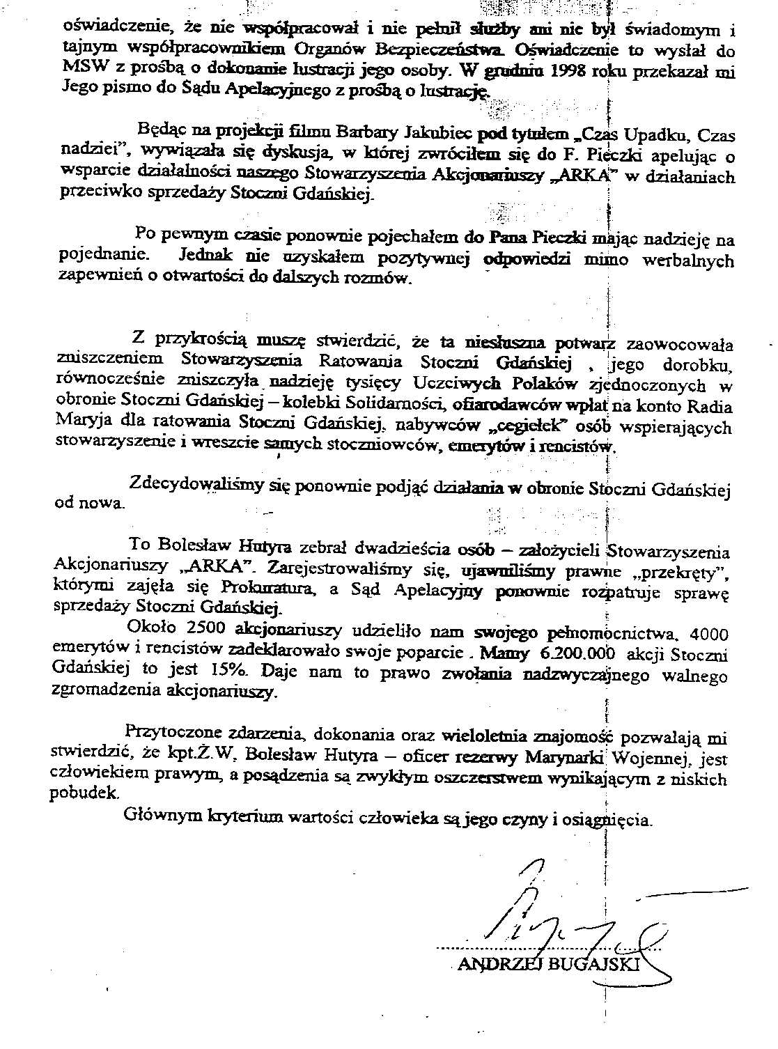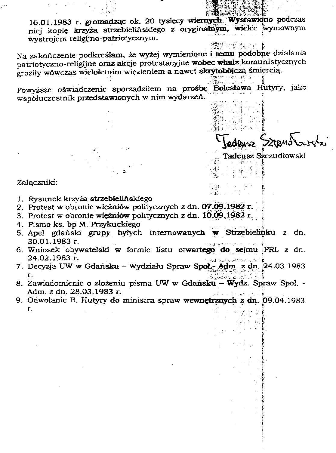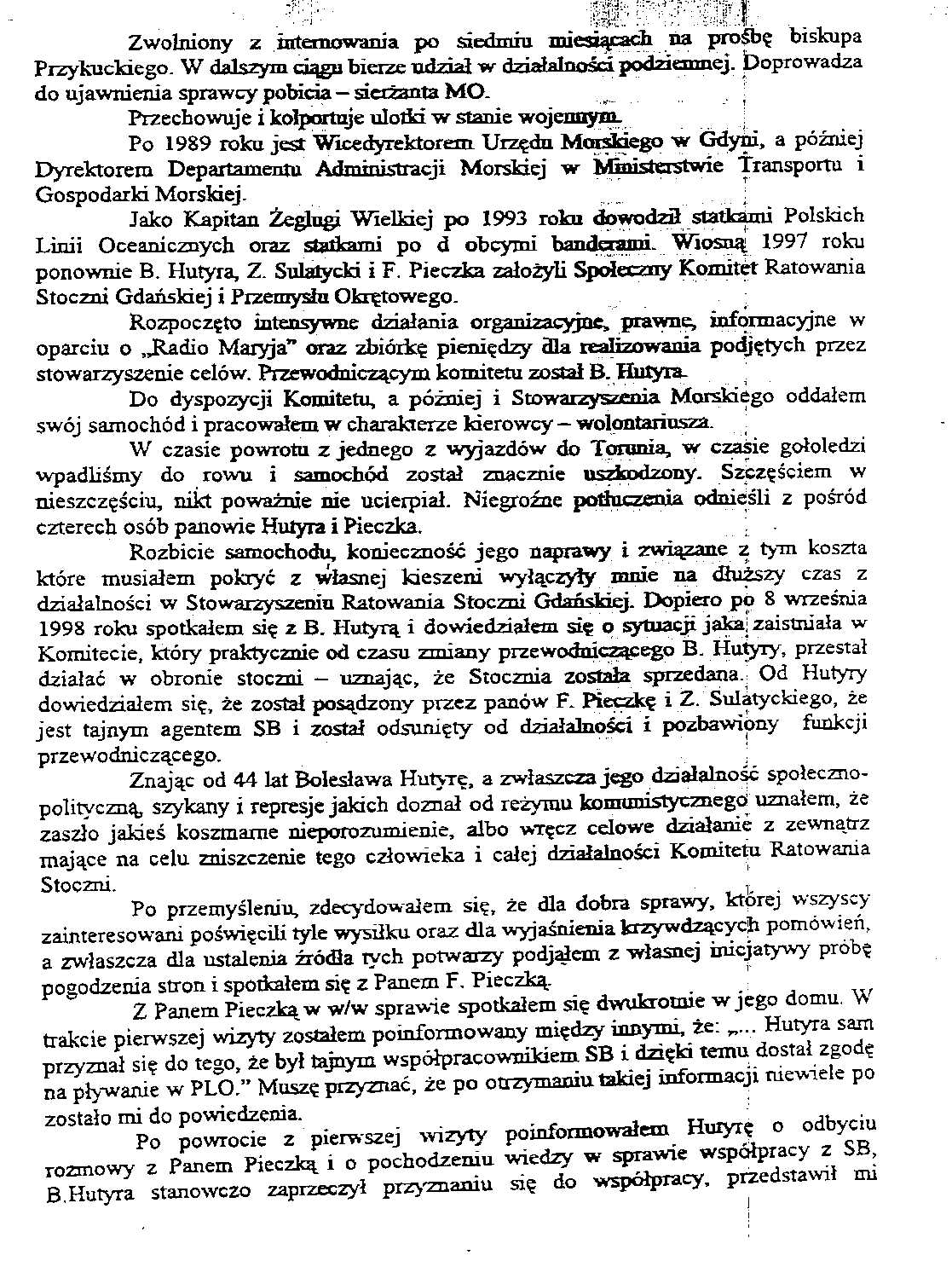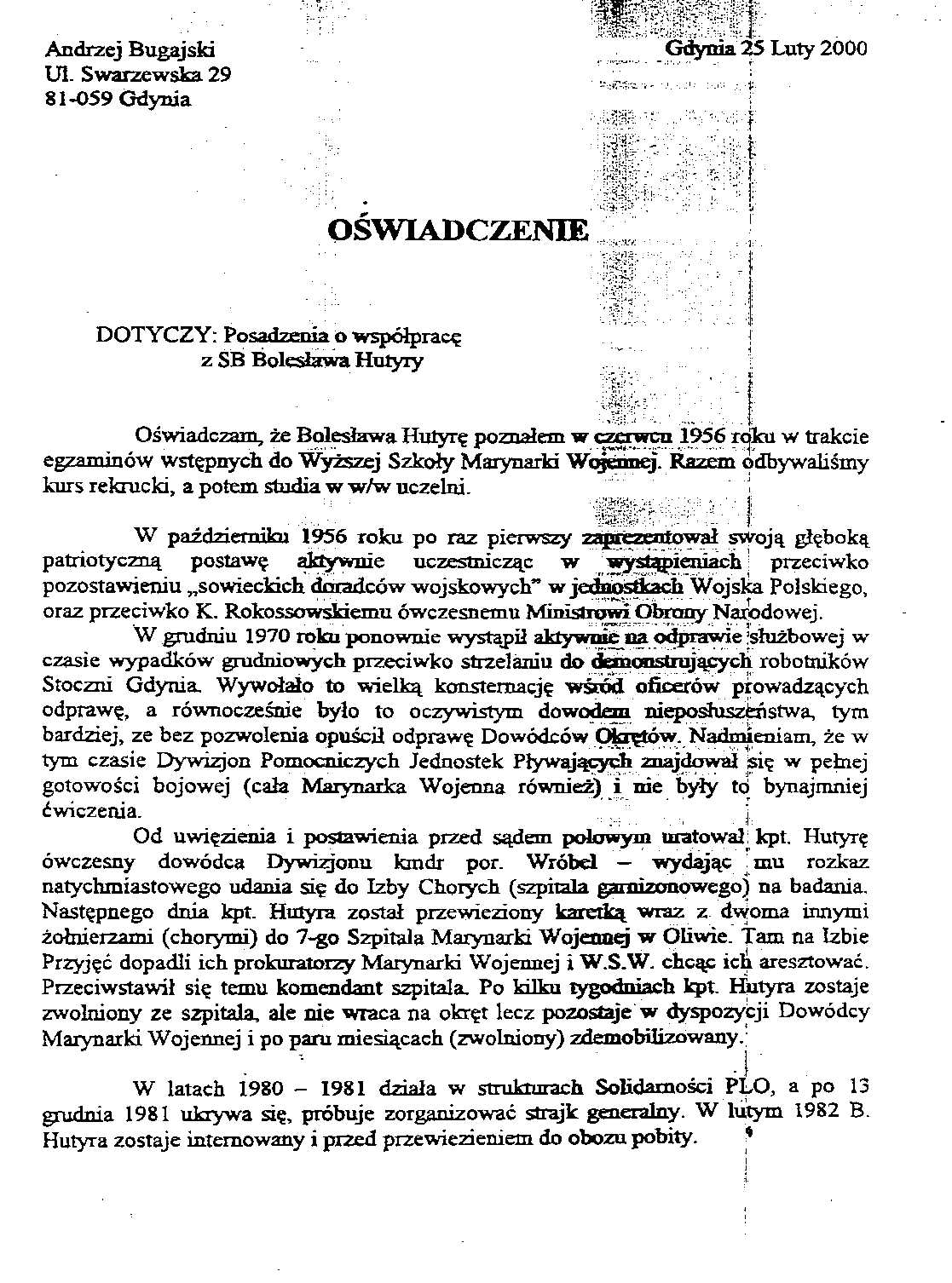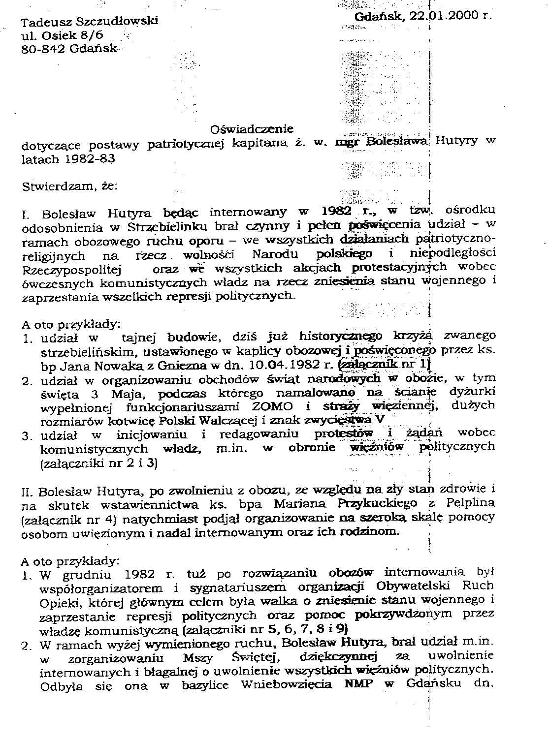 - 22 I 2000: oświadczenie dot. postawy B. Hutyry w latach 1982-83,