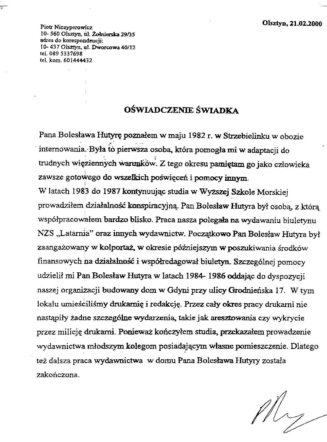 - 21 II 2000: oświadczenie świadka dot. B. Hutyry, P. Niezyperowicz